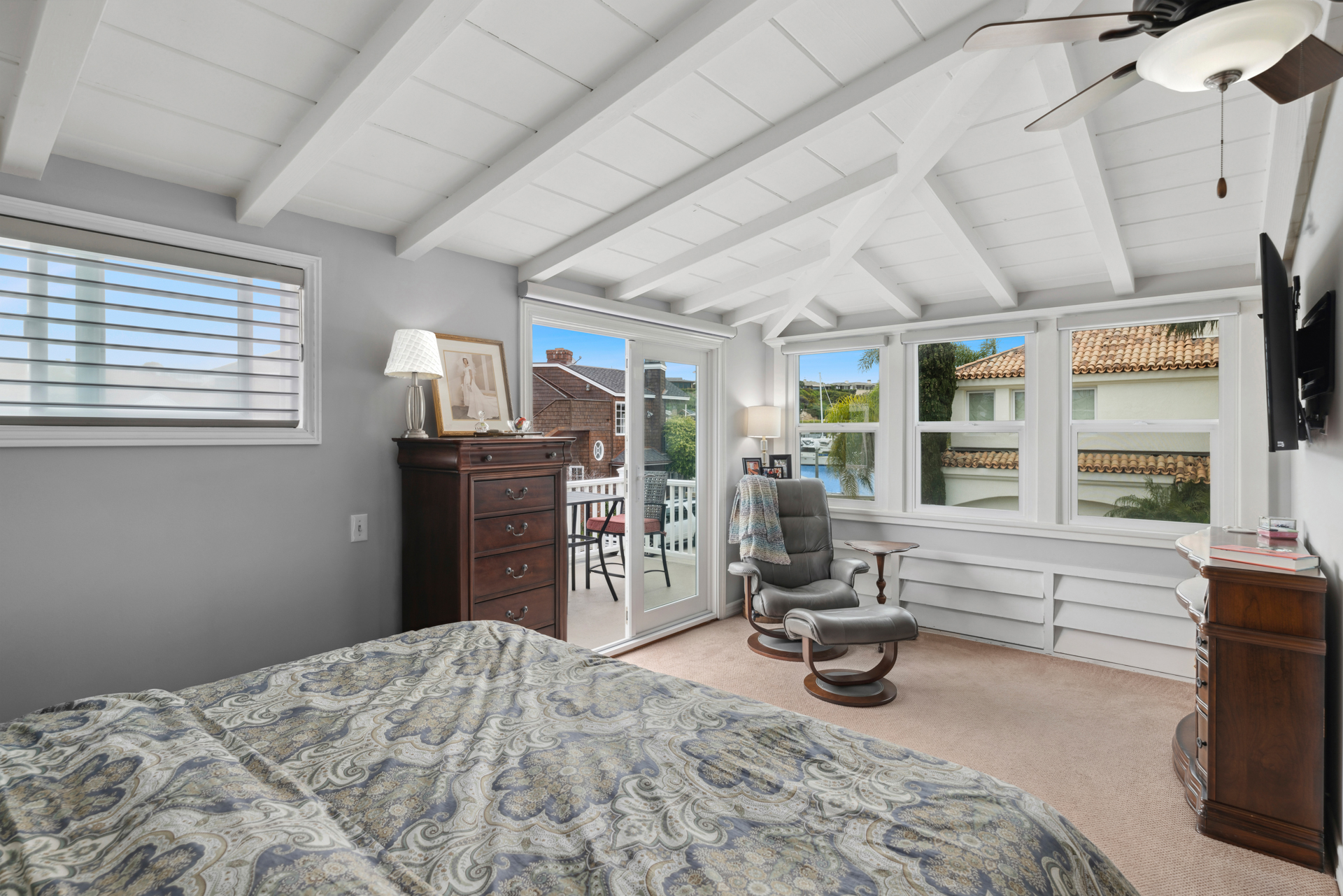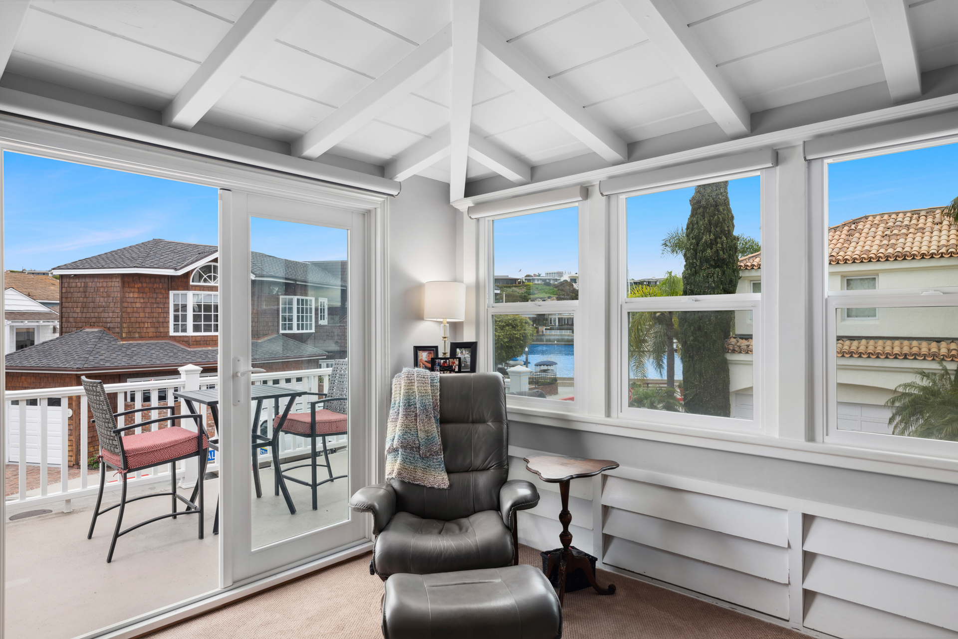 Here is the quintessential Balboa Island cottage, strategically perched on a sunny Bay-view corner lot on the peaceful and serene Little Island. The spacious, elevated brick-lined front patio opens into the home through a Dutch door or multi-panel sliding doors. The expansive living and dining areas then lead to an updated chef's kitchen, all with stunning water views. The second level showcases 3 bedrooms with vaulted beamed ceilings, including the oversized primary suite with its own generous balcony. Among the home's many fine attributes are quartz counters, central A/C, luxury vinyl floors, and a two-car garage. Both the patio and upper deck provide front-row views of Newport Harbor without the inconvenience of pedestrian boardwalk traffic. Little Balboa Island has underground utilities, wide streets, lots of fresh salt air and sunshine. Don't miss this wonderful home!